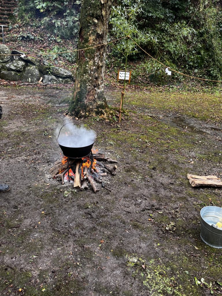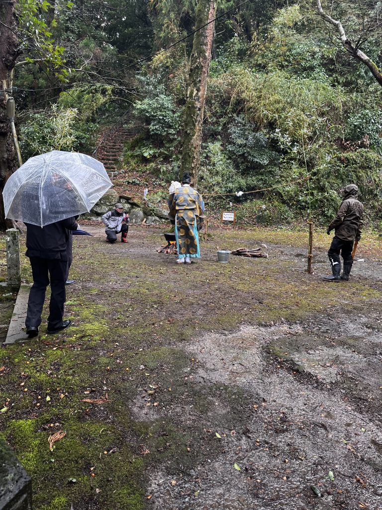 さて、管粥神事の当日の天候は小雨が降り続き、風も強く、生憎の天候となりました。