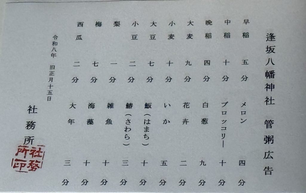 管粥神事は旧暦の一月十五日に執り行われます。
